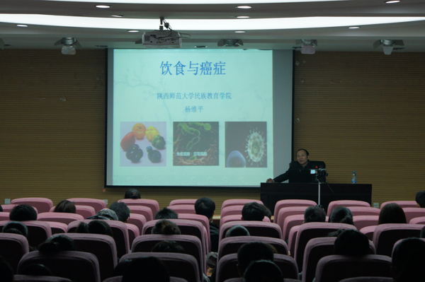 讲座开始,杨维平老师列举了2005年全世界死于癌症的人数,据统计,在全世界死于癌症的人数中,有70%发生在发展中国家。癌症中有20%的由慢性病引起,这些病如果早发现,早治疗,有三分之一的是可以治愈的。杨老师对癌症的可能病因,饮食致癌,饮食抗癌,营养成分与癌症,食物与癌症,饮酒与癌症等方面进行了解说。其中,杨老师尤其以饮食致病为例,从致病背景,癌变机理,食物中公认的致癌物等几方面做了详细介绍。并叮嘱大家在生活中一定要注意饮食习惯,不能偏食但也不能随心所欲的饮食,要合理、科学的饮食。对饮食的几点建议是同学们最关注的一点,杨老师指出,多吃如玉米、红薯、南瓜、大蒜、茄子、苦瓜等有天然的抗癌作用食物,多吃蔬菜、水果和纤维含量高的食物,注意饮食的多样化,不吸烟,限制酒精的摄取。在讲座的最后,杨老师指出,饮食只是导致病变甚至发展到癌症的诸多原因之一,因为诸如遗传、病毒、吸烟、环境因素等都可导致病变甚至癌变,需要大家在日常的生活中多多了解,远离发病源头,做到早防早治。