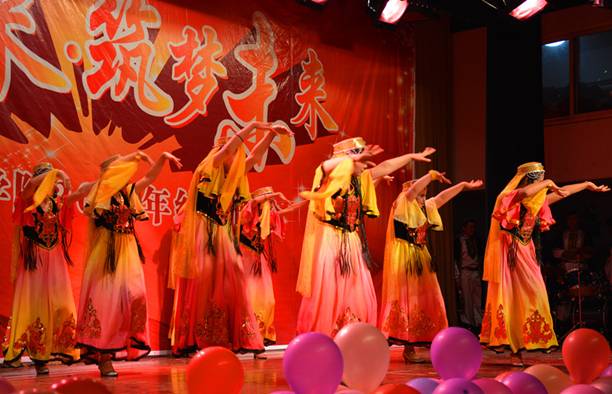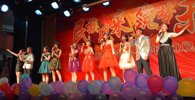 晚会正式开始前,首先进行了颁奖仪式,重点表彰了对在2014—2015学年度中表现突出的优秀学生、优秀学生干部,以及在民族团结活动月中表现优异的学生和集体。院长冯建新和党总支副书记窦文阳宣读获奖名单,学工部副部长芮国星、党总支书记郑生忠上台为获奖学生颁奖并合影留念。接下来,在一曲哈萨克传统舞蹈《恰熟》中,晚会正式开始。歌舞《中国我为你歌唱》、合唱《爱我中华》表现了当代青年学子朝气蓬勃、积极进取、昂扬向上的新形象;预科同学带来的舞蹈《吉祥谣》、《萨吾尔登》、《刀郎舞》、《梦幻花园》、《赛马舞》、《异域风情》展示了我院少数民族同学能歌善舞、多才多艺的一面,也向我们展示了各少数民族独有的民族风采和异域风情;民硕同学带来的《希望之光》、《青春·印记》、《假面奇迹》,将晚会推向高潮,使我们在动感十足的舞蹈和音乐中感受了一股青春律动的气息和对理想的执着追求;乐队《离不开月亮》、歌舞剧《A night to remember》、B-box+乐队《公路之歌》等节目以别样的形式和新颖的设计,引起全场的热烈掌声。每一位表演的学生都在用他们的努力和汗水向青春致敬,感念在师大这一年的学习与生活。最后,由在我校第十三届star擂台总决赛中获得“star之星”的天山儿女组合带来的精彩歌舞,晚会顺利落下了帷幕。