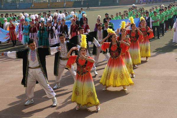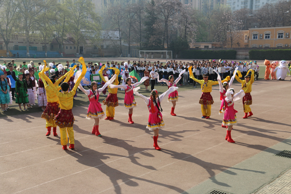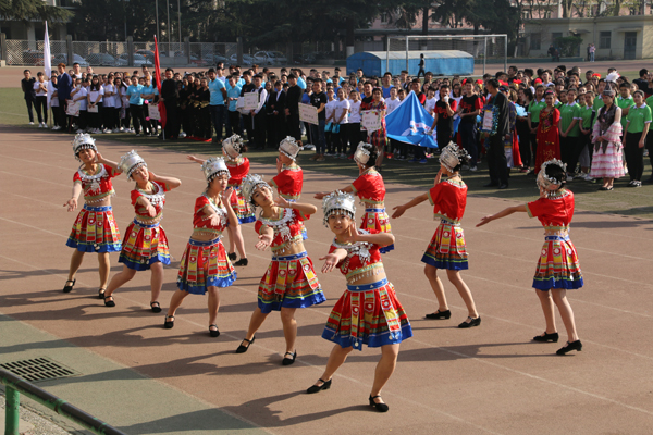 在开幕式表演中,由预科同学带来的啦啦操表演活力四射、热情洋溢,整齐划一的节拍、阳光青春的笑容,赢得了全场师生的阵阵喝彩。接下来由预科各班级学生精心准备的哈萨克族、维吾尔族、苗族和藏族舞蹈表演,将开幕式推向了高潮,曼妙的民族音乐配着轻快的步调,为本次运动会增添了一抹亮丽的民族和谐色彩。