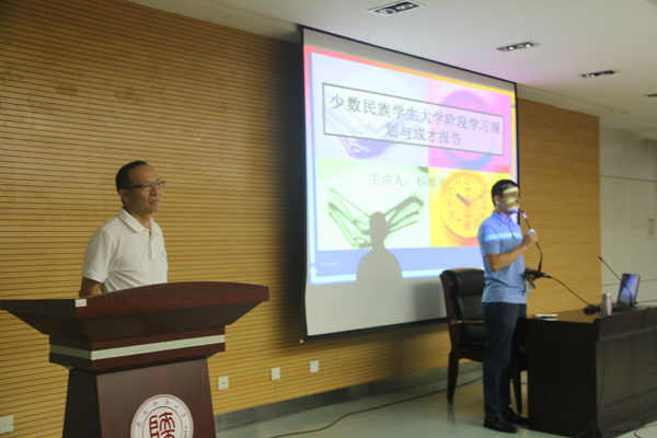 办学历程为切入点,向同学们介绍了众多曾经在我院学习的杰出校友,希望同学们向榜样看齐,严格要求自己。接着,他以世界知名大学为介绍背景,向同学们讲述了大学的内涵,希望同学们尽快适应大学生活新变化,制定目标,健康成才。最后,杨维平教授为同学们认真细致地分析了“自信、刻苦、阅读、沟通、责任、感恩、爱国”这七条少数民族学生成才的基本要素,他强调作为一名少数民族大学生,爱国是最基本要素,要常怀感恩之心,要有责任感,要不断历练个人意志。