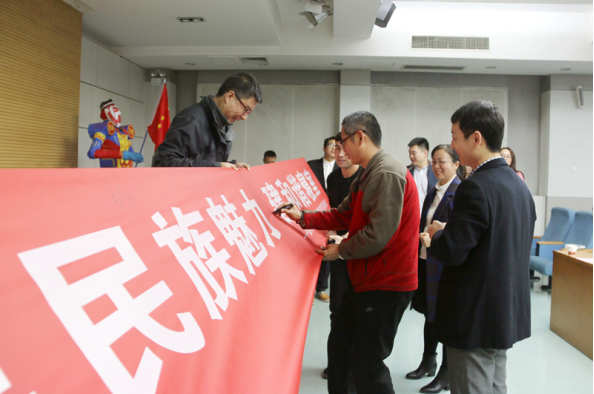 在手工作品展示环节中,预科生展示了通过对废旧物品循环再利用而制作的收纳盒、纸椅、爆米花机、师大三维模型、婚纱礼服、机器人等作品。独具心思、制作精致的手工作品受到现场嘉宾和同学们的一致好评。最后,启动仪式在师生签名、合影留念中圆满结束。
