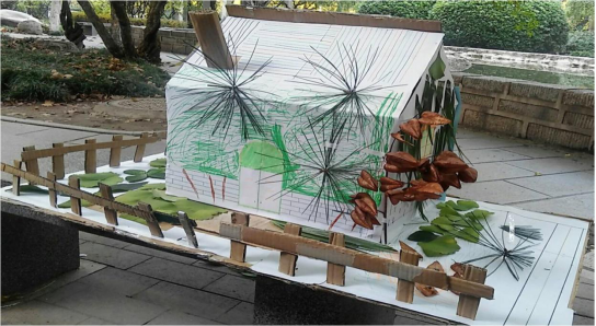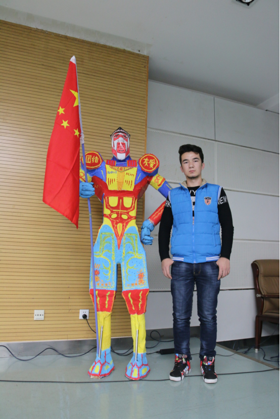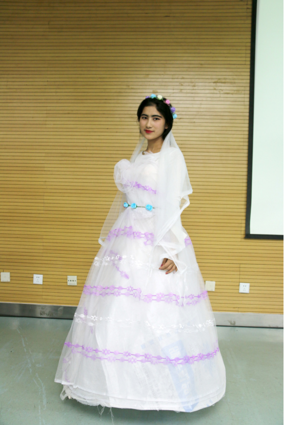 手工艺品众多作品中共有19个作品进入评选环节。评选中,主持人马璇同学为大家播放幻灯片,详细介绍了各班同学利用废弃品制作的手工艺品。同学们充分发挥自己的想象力,让本已毫无价值的废品获得第二次生命,有废纸盒制作的精美收纳盒、一次性纸杯纸做的玲珑装饰品、废报纸插出的独特花束等等,它们外观静美,做工细腻,创意独到,很好的诠释了本次活动的主题,拓展了学生的发散思维和动手实践能力。手工艺作品中最具吸引眼球的有两个作品,预科3班萨达·阿依努尔古丽等人制作的婚纱作品,她们利用衣架做婚纱的群撑,用蚊帐做蕾丝裙和头纱。预科6班阿力木·艾尔肯为自己制作的巨人起名为“ROBOT”,他利用废弃的纸盒,亲手设计、粘贴、图画出一个高大身躯,臂膀魁梧的机器人,在手中插着的红旗代表飞扬的中国梦——预科梦。