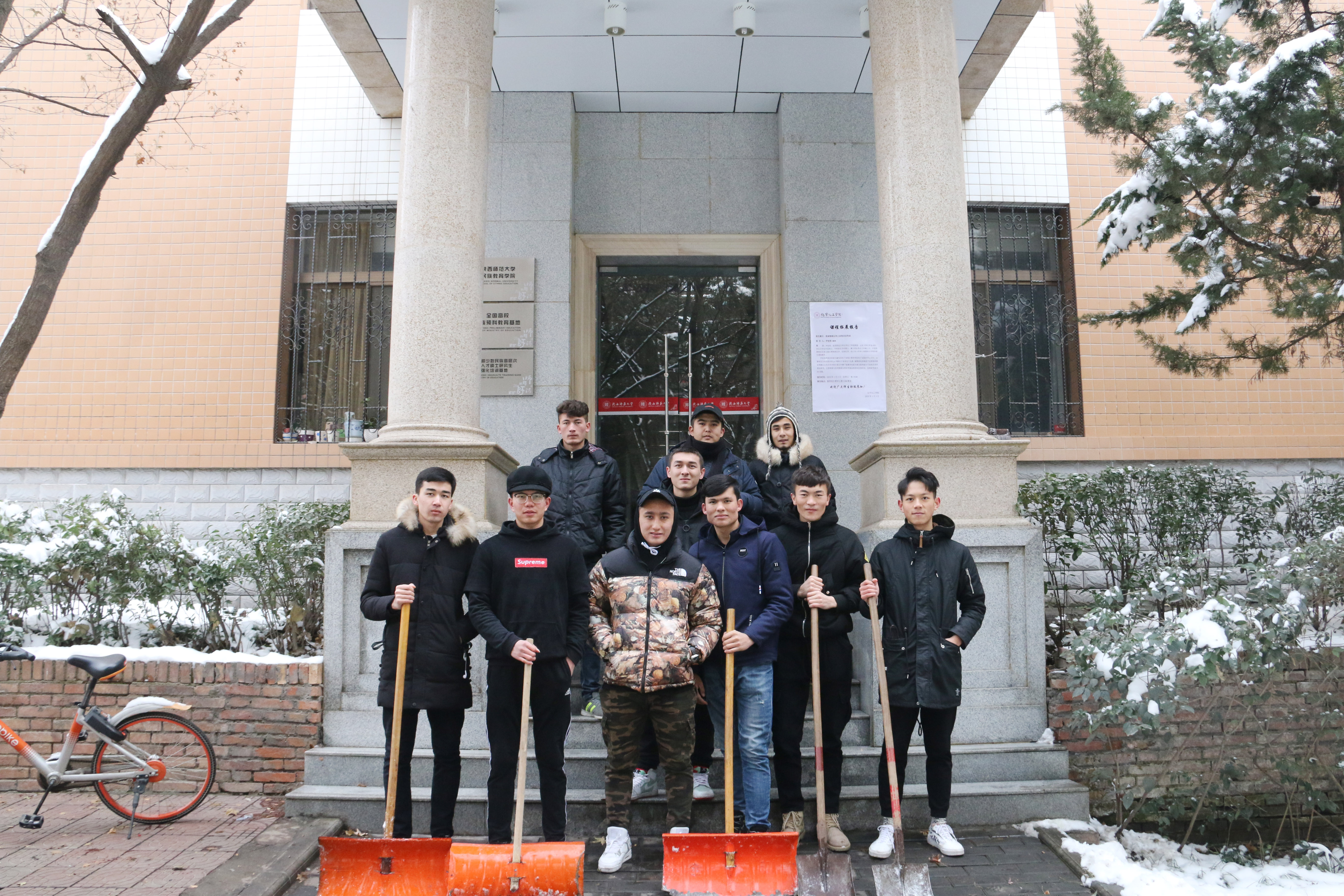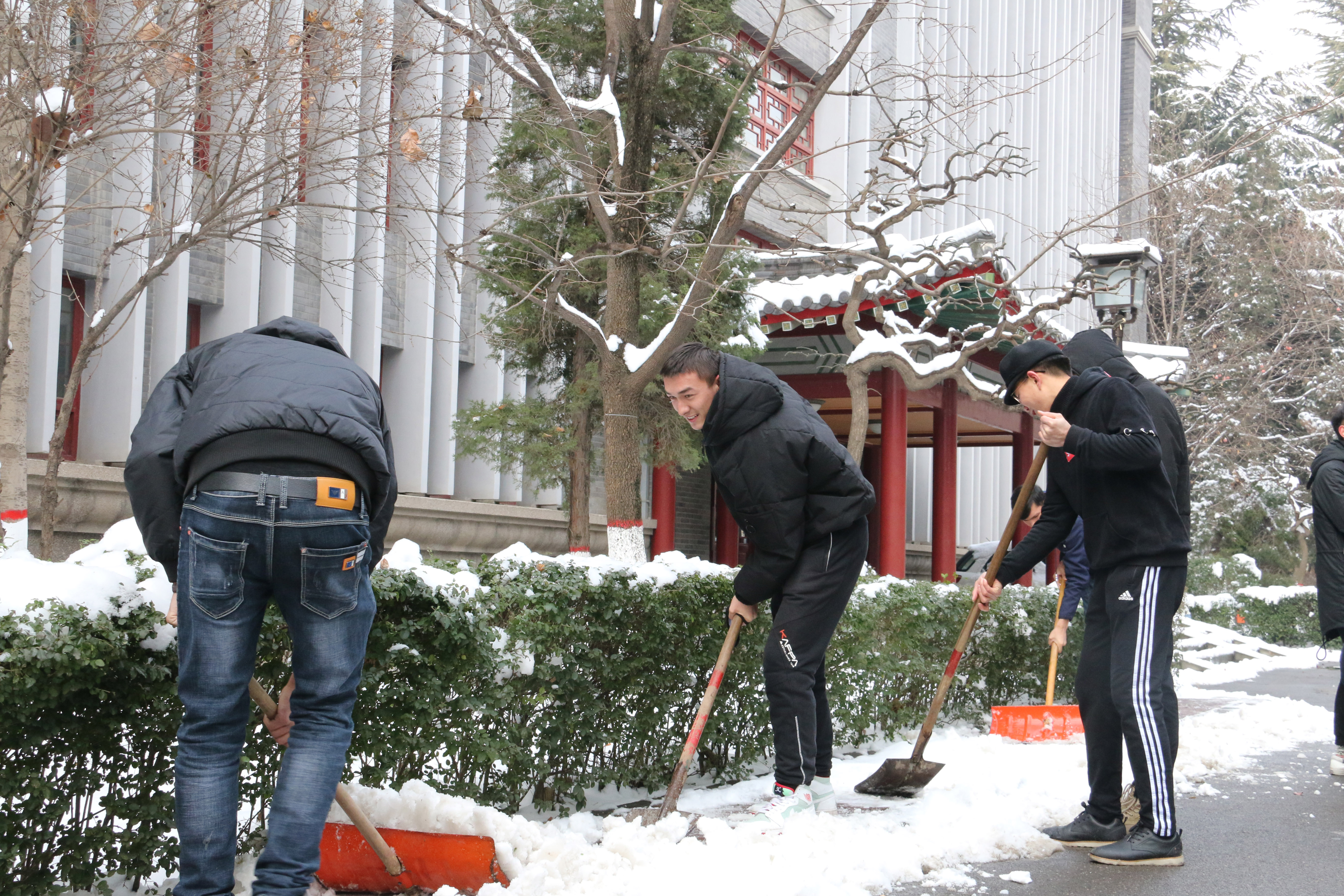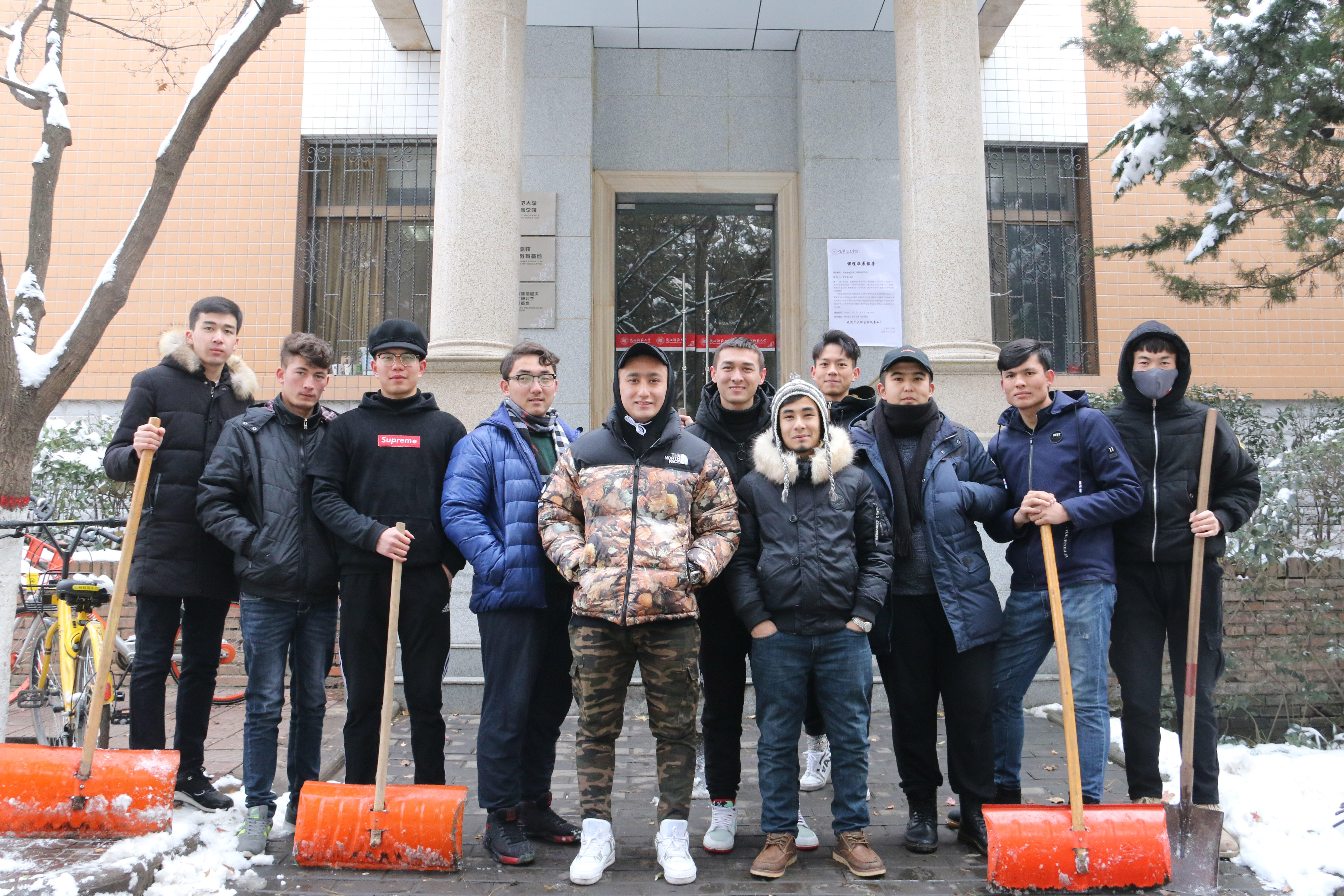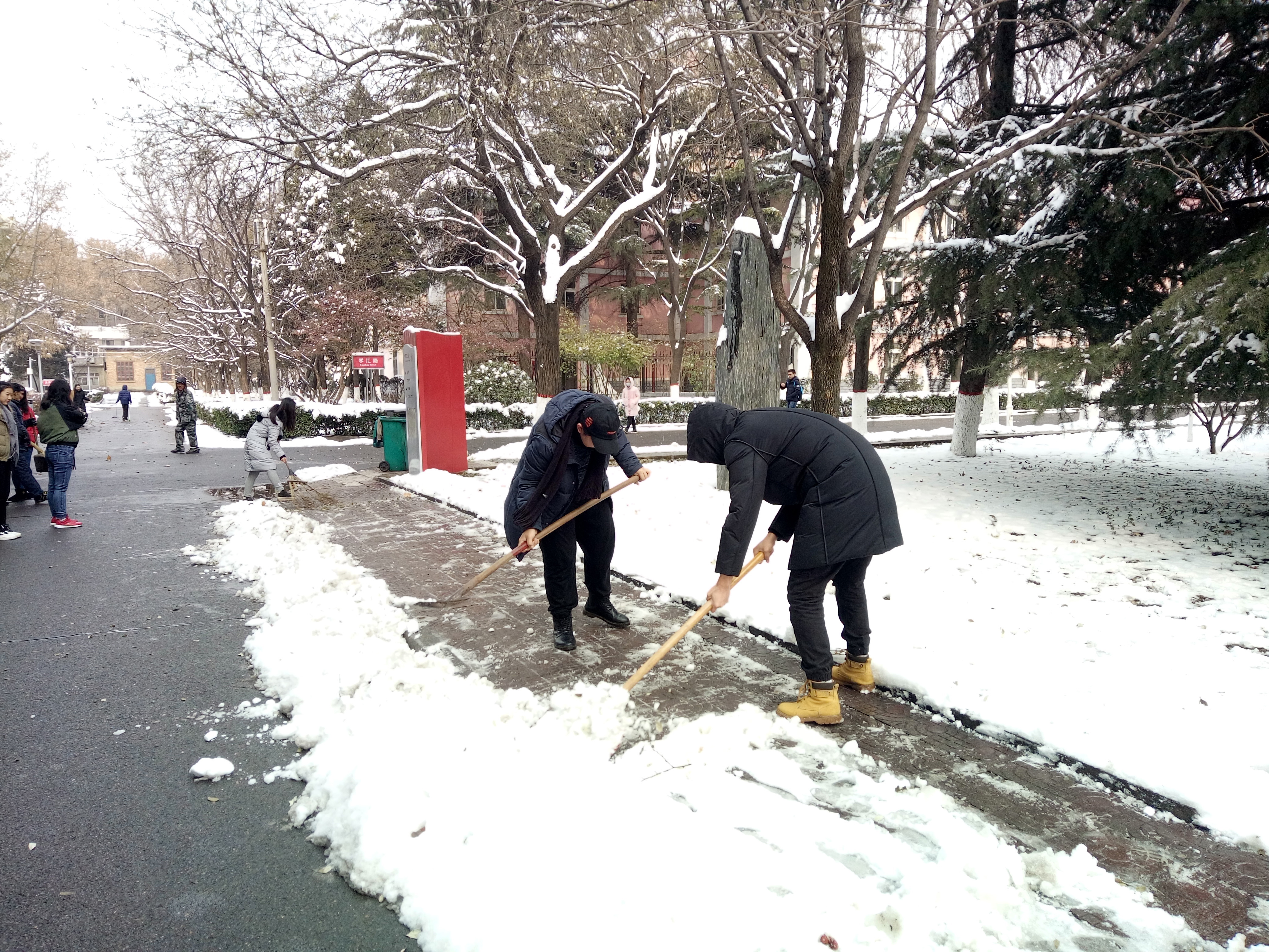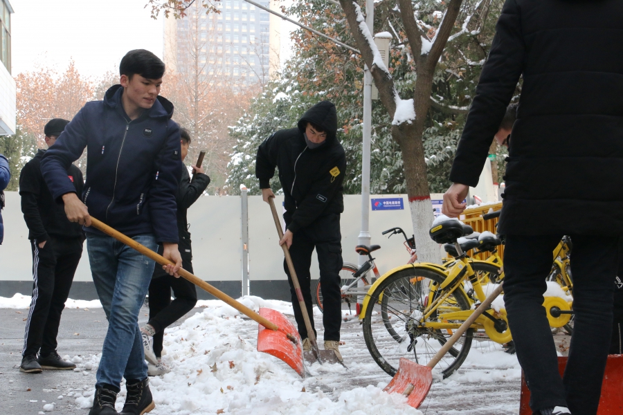 我院从后勤服务处物业科借来了扫雪用的铁锹、扫帚等工具,同学们不畏严寒,积极参与,相互配合,有的同学负责扫雪,有的同学负责铲冰,大家干得热火朝天,忙碌的身影构成了一道亮丽的风景线。虽然室外温度很低,但大家劳动的热情和团结协作的场面让这个冬日变得格外温暖。经过一个小时的奋战,六附楼周围和主干道的积雪全部铲除,原本满是冰雪的道路变得干净整洁,路面状况、通行能力得到明显改善,为广大师生提供了便利。