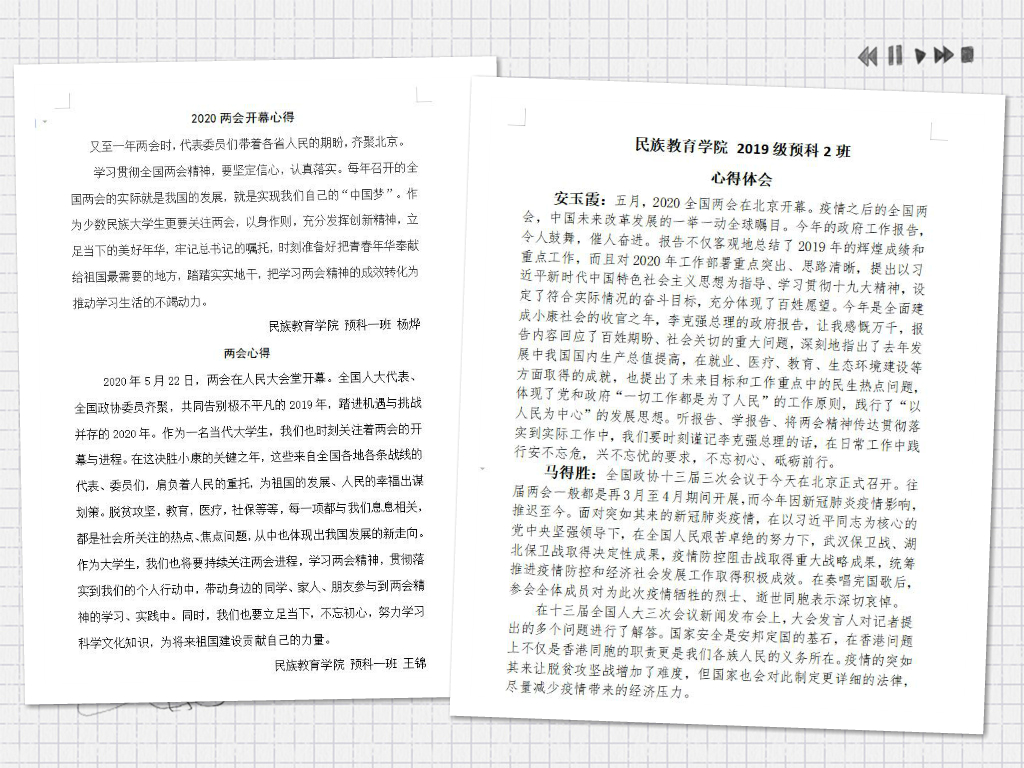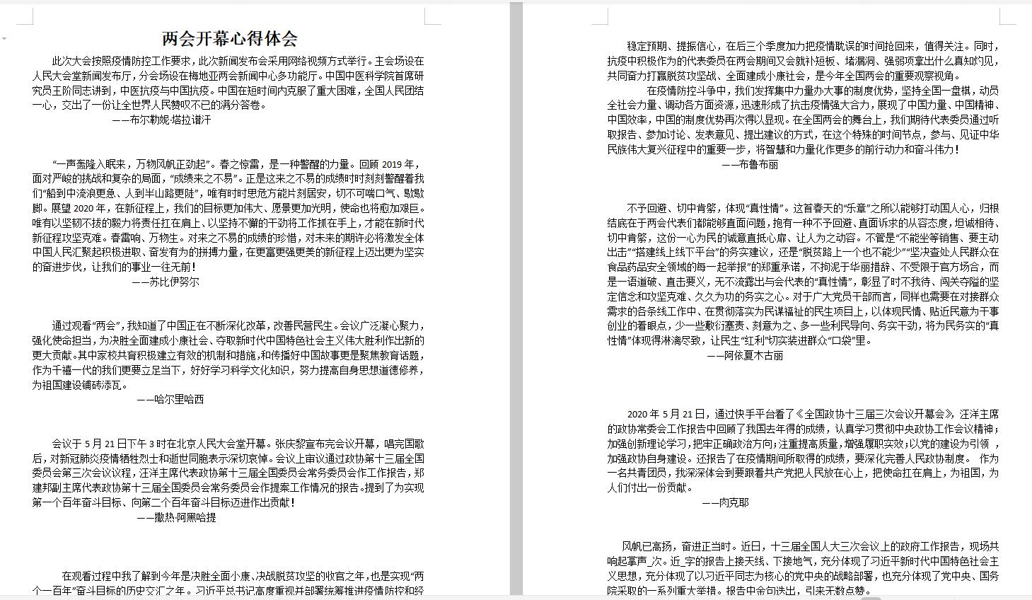 会后学院党总支副书记窦文阳发表感言,认为作为党员的我们更加不能置身事外,要认真学习贯彻习近平总书记的重要指示精神,增强“四个意识”,坚定“四个自信”,做到“两个维护”,努力把国家民族教育事业的各项任务和要求落到实处,不忘初心,砥砺前行;学院专职辅导员热依木说道:为了战“疫”需要,今年的“两会”推迟了两个多月举行,这本身就反映了我们面对突如其来的新冠肺炎疫情,能把人民群众的生命财产安全和身体健康放在第一位。作为高校民族预科班学生辅导员,要积极响应党和国家号召,爱岗敬业,积极作为,立足本职勇于担当,为早日实现中华民族伟大复兴的中国梦而努力奋斗;2019级预科1班学生杨烨谈道:学习贯彻全国两会精神,要坚定信心,认真落实。每年召开的全国两会的实际就是我国的发展,就是实现我们自己的“中国梦”。作为少数民族大学生更要关注两会,以身作则,充分发挥创新精神,立足当下的美好年华,牢记习近平总书记的嘱托,时刻准备好把青春年华奉献给祖国最需要的地方,踏踏实实地干,把学习两会精神的成效转化为推动学习生活的不竭动力;2019级预科2班学生安玉霞谈道:今年是全面建成小康社会的收官之年,李克强总理的政府报告,让我感慨万千,报告内容回应了百姓期盼、社会关切的重大问题,深刻地指出了去年发展中我国国内生产总值提高,在就业、医疗、教育、生态环境建设等方面取得的成就,也提出了未来目标和工作重点中的民生热点问题,体现了党和政府“一切工作都是为了人民”的工作原则,践行了“以人民为中心”的发展思想。我们要时刻谨记李克强总理的话,珍惜时代,勤奋学习,养成良好生活学习习惯,不忘初心、继续前行。2019级预科3班学生哈尔里哈西谈道:通过观看“两会”,我知道了中国正在不断深化改革,改善民营民生。会议广泛凝心聚力,强化使命担当,为决胜全面建成小康社会、夺取新时代中国特色社会主义伟大胜利作出新的更大贡献。其中家校共育积极建立有效的机制和措施,和传播好中国故事更是聚焦教育话题,作为千禧一代的我们更要立足当下,好好学习科学文化知识,努力提高自身思想道德修养,为祖国建设铺砖添瓦。