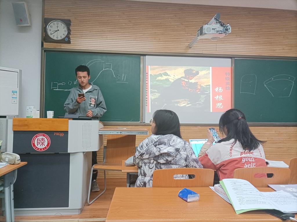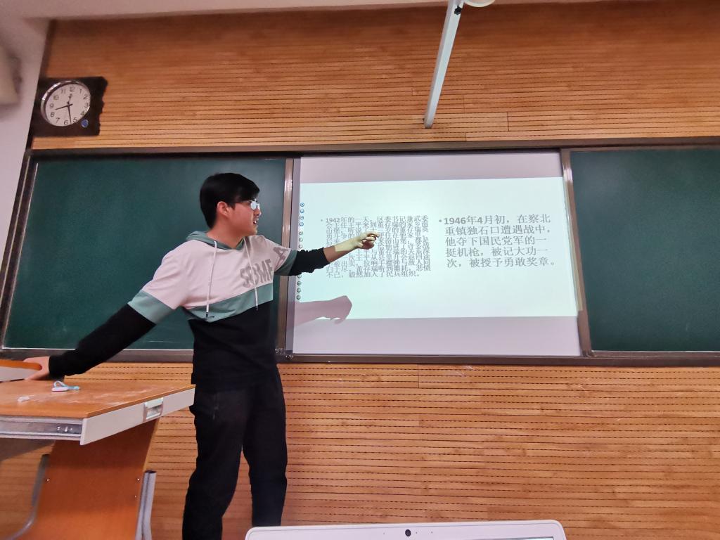于2020年11月5日开展抗美援朝相关主题班会活动。主题班会由组织委员黄学格的发言拉开序幕。随后,她通过对抗美援朝背景的介绍,让同学们身临其境的感受上世纪五十年代那段艰苦卓绝的岁月:战争的号角迅速吹响,无数志愿军战士雄赳赳气昂昂跨过鸭绿江,怀着视死如归的信念和对祖国的热忱爱恋,不远万里,背负武器,奔赴战场。英雄们的事迹深深感染了在座的每一位同学,大家无不热血翻涌,为先烈的拳拳爱国之心,舍生忘死的精神所感动。随后,四位同学代表以微团课的形式向同学们介绍了抗美援朝时期的历史事件与英雄人物。刁文妍同学介绍了长津湖战役中志愿军身着单衣,在大雪地中埋伏数天后阻击美军坦克而扭转战势的壮举,陈泽西、马远东、马博亚同学分别通过邱少云为不暴露军队行踪永存烈焰中,杨根思危急关头抱着炸药包冲入敌群等志愿军战士为保卫祖国奉献牺牲的故事,展现了志愿军将士的英雄气概和不畏强敌、知难而进的伟大意志力。