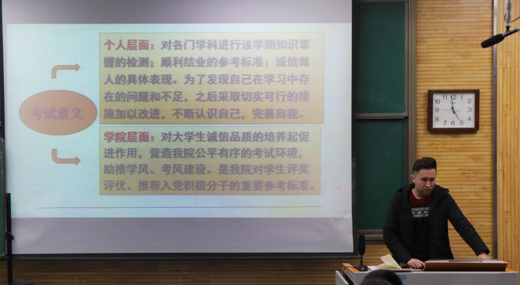 其次,专职辅导员热依木从考试时间安排、考试要求、缓考条件与流程等几个方面进行了详细说明,特别强调期末考试在个人层面和学院层面的重要意义。