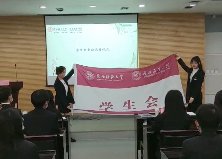 上任学生会主席沈翰蒙与新任学生会主席何诺冉做学生会会旗交接