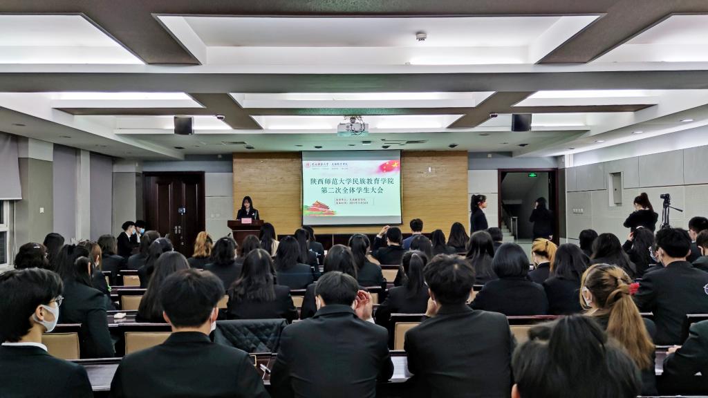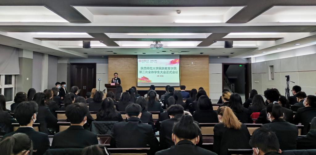 第二次全体学生大会正式会议在雁塔校区崇鋈楼思齐堂、闻道堂主、分会场同步召开。学院党总支书记郑生忠,副书记高冬,团总支书记热依木·努尔麦麦提,专兼职辅导员王霞、谢成玉、夏逸静和学院全体学生参加了本次大会。会议由学院团总支副书记、大会筹委会委员童琬舒主持。