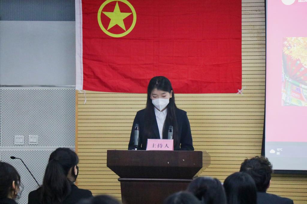 新一任主席团成员萨齐日介绍了新一届学生会各部门的成员组成和职能属性。2022-2023学年新任学生会执行主席陈彦语与2021-2022学年学生会执行主席何诺冉完成了会旗交接。