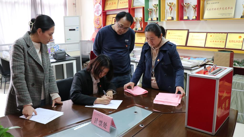 总支部委员会党员大会选举办法(草案)》、总监票人、监票人和计票人名单。随后,龙宝新介绍了新一届党总支委员会委员候选人预备人选酝酿产生情况及候选人基本情况。大会严格按照换届选举办法及相关程序,采取无记名投票、差额选举的方式进行。大会选举产生了由龙宝新、成珊娜、郑生忠、热依木·努尔麦麦提、高冬(按姓氏笔画为序)等五位同志组成的新一届党总支委员会。