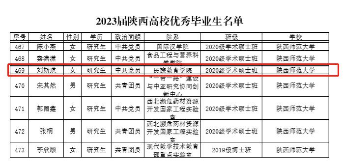 近日,陕西省教育厅办公室印发《关于2023届陕西高校优秀毕业生和优秀学生干部评选结果的通报》,经学校推荐,省教育厅评审,我校共38位研究生进入获奖名单,作为其中之一,我院刘斯琪同学获得“陕西省高校优秀毕业生”荣誉。该奖项是继2022届硕士研究生王奕迪同学之后,又一次获得此殊荣,也是我院研究生教育所取得的重大成绩之一。