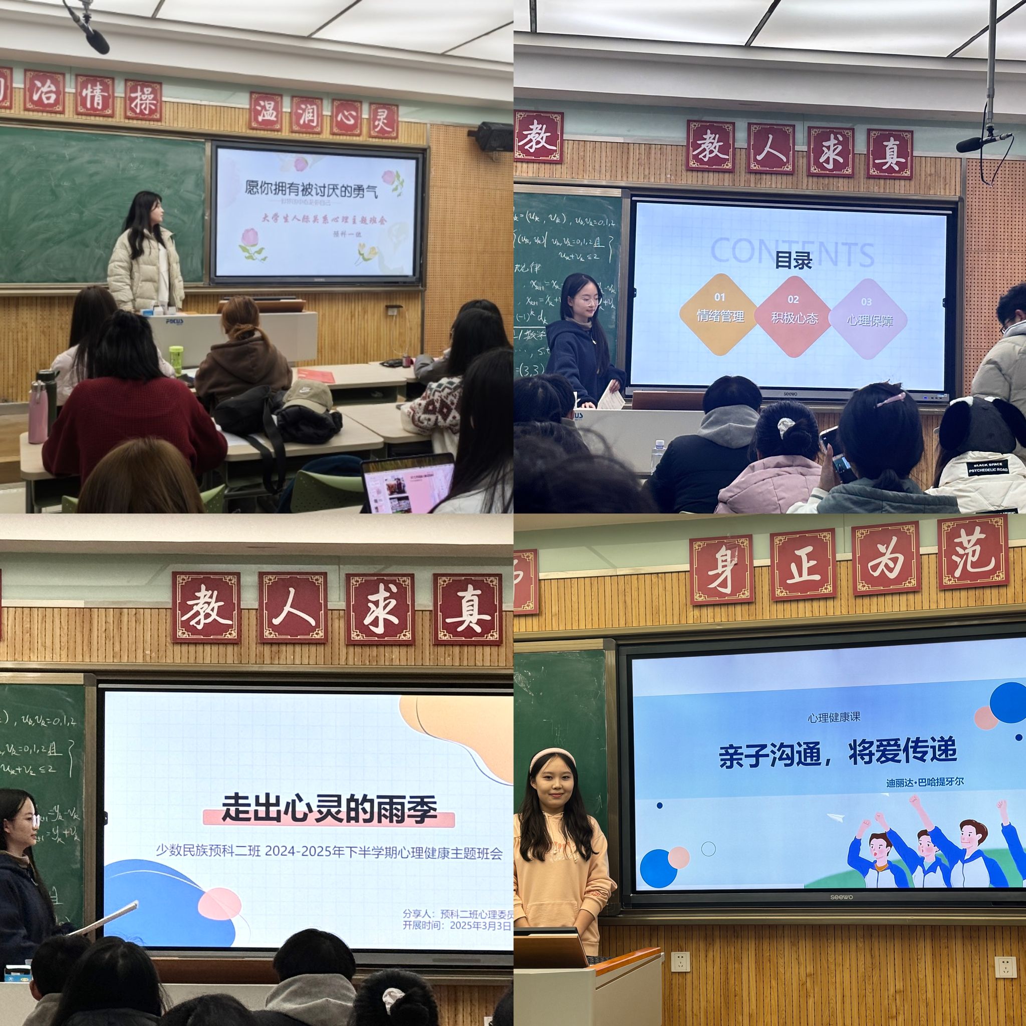 为深化学生对心理健康的认识,学院各预科班级以晚自习为契机开展了一系列心理主题班会。预科一班心理委员马欣雨主持“愿你拥有被讨厌的勇气”主题班会,从心理学视角多维度剖析人际交往中焦虑情绪的成因机制,引发全班同学热烈讨论与深度思考。预科二班心理委员孙钡以“走出心灵的雨季”为主题,系统讲解心理健康理论知识,结合大学生生活实际提供多元化心理调适方案。预科三班心理委员迪丽达・巴哈提牙尔开展“亲子沟通,将爱传递”主题班会,聚焦当代大学生亲子沟通难点,探索民族文化背景下的亲情联结新路径。