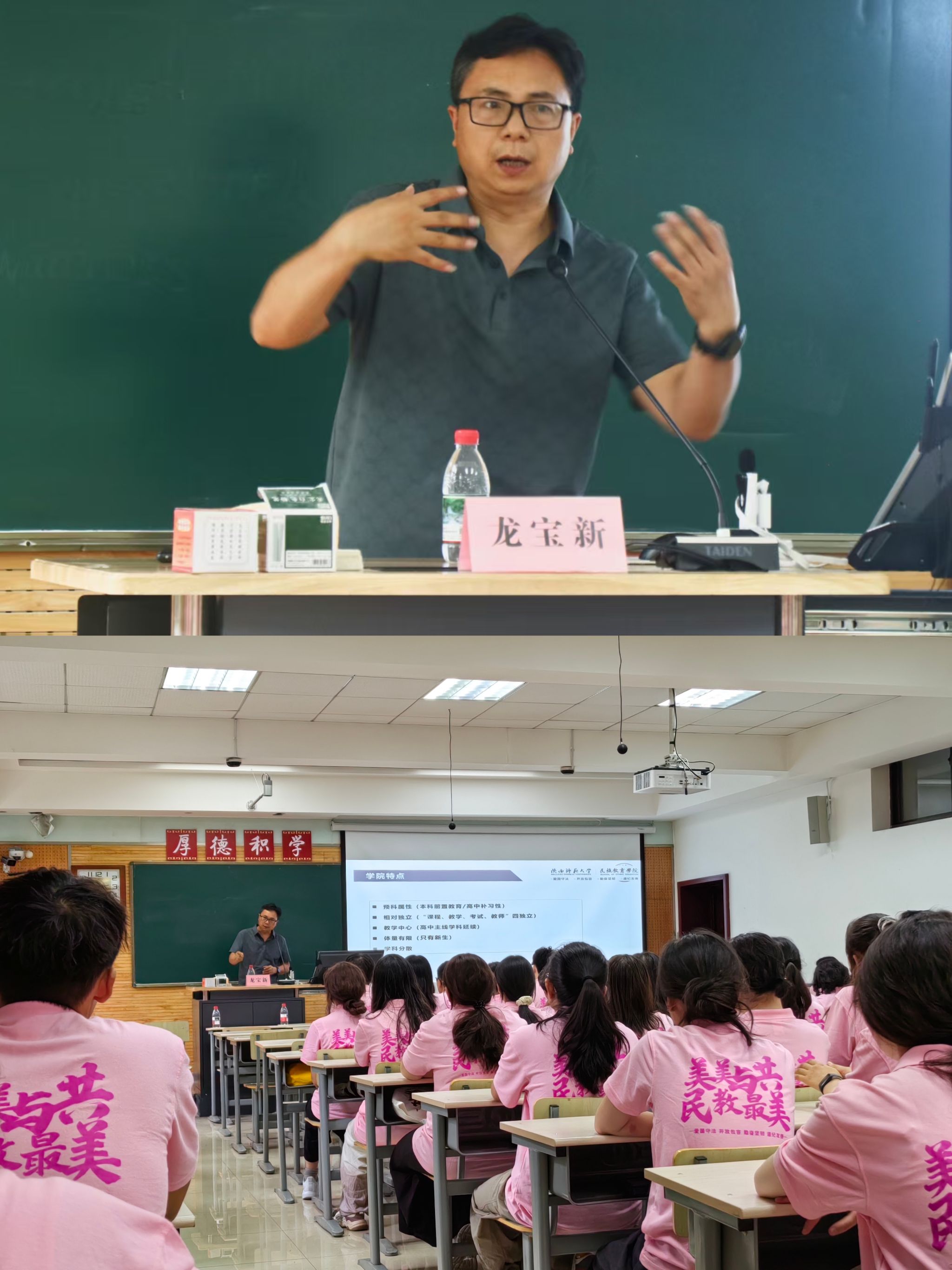龙宝新围绕预科阶段的学习特点、重要意义以及合理规划,以幽默风趣的风格分享自身校园经历,他强调预科学习不仅能帮助新生提前适应本科教学节奏,更能培养自主学习能力与抗压能力,为后续专业学习与个人发展筑牢根基。与此同时他向全体同学提出五点建议:一是扎实学习基础,学会做人做学问;二是了解自我专长与兴趣,考虑专业定向;三是发展兴趣、特长,提高个人素养,增强综合能力;四是做好本科前补短工作;五是严格遵守学校相关教学管理规定。