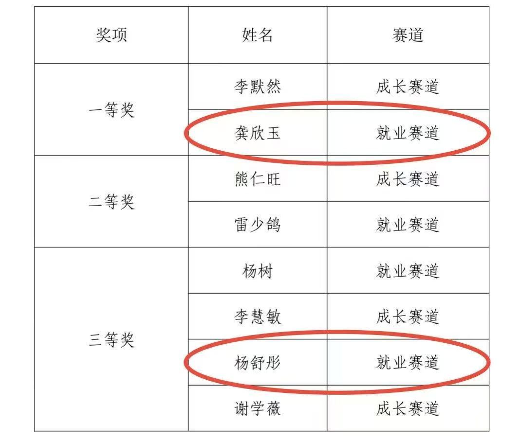 学子表现突出,喜获佳绩:龚欣玉荣获就业赛道一等奖、杨舒彤荣获就业赛道三等奖。